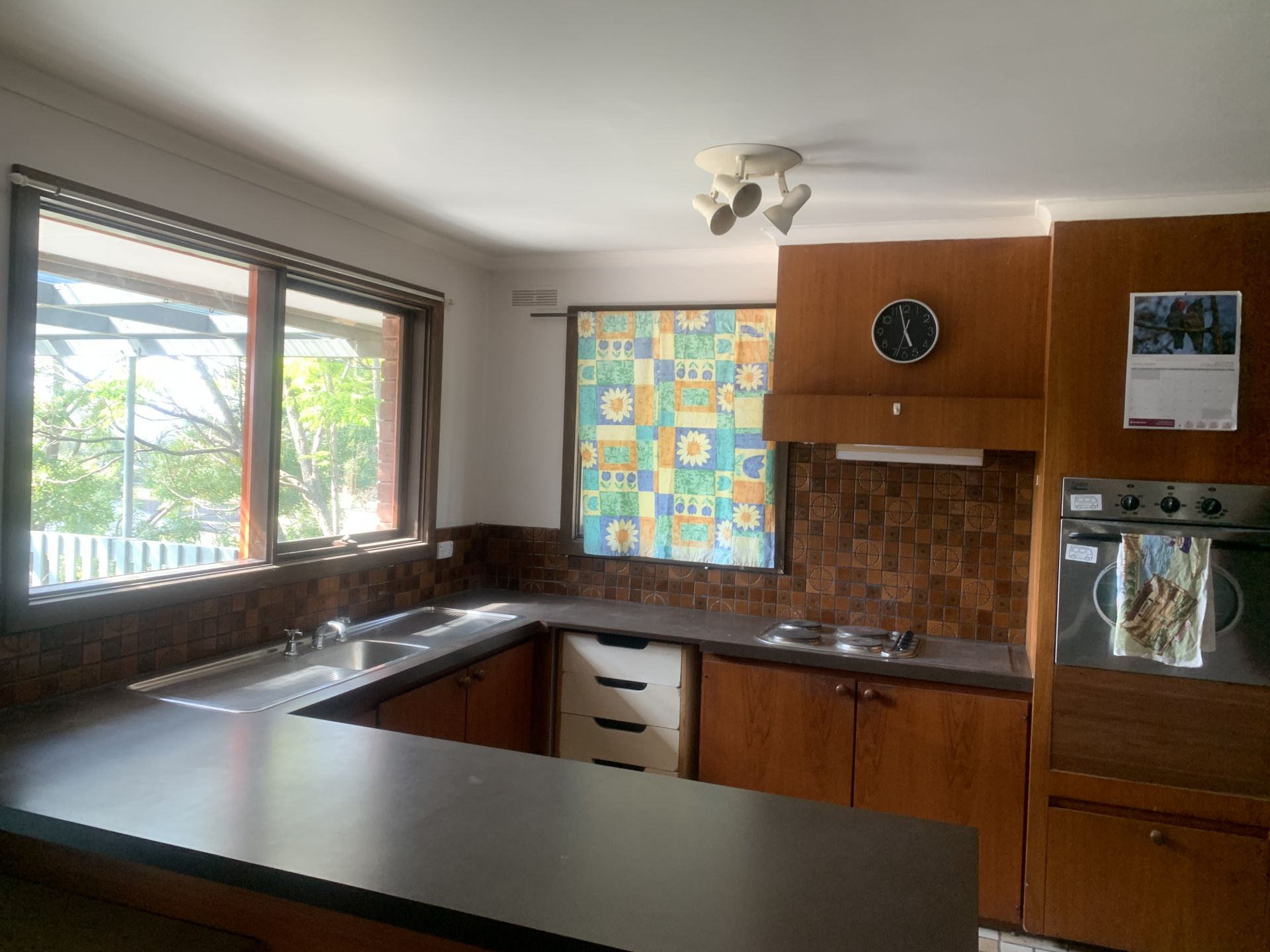 Kitchen has electric cooking and plenty of cupboard space.