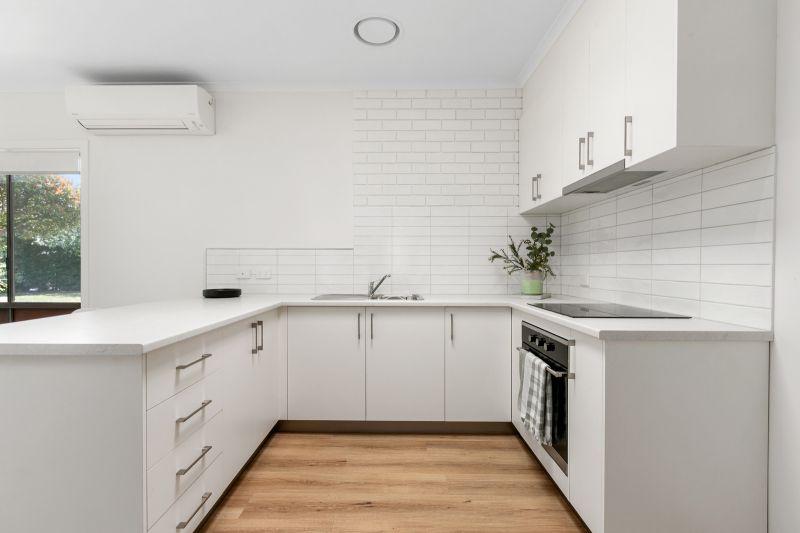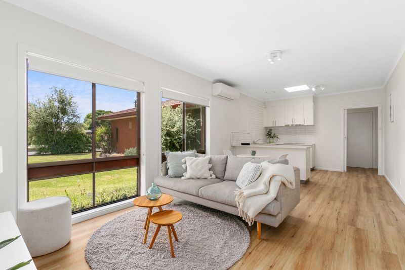 An open-plan dining and living area boasting new flooring, a split-system air conditioning unit and gas heater for year round comfort.