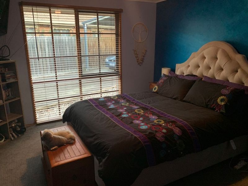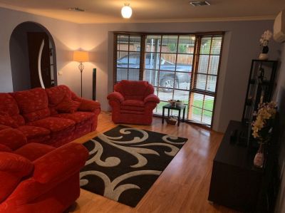 Loungeroom has large bay windows for extra light, floor boards, central heating and split system.