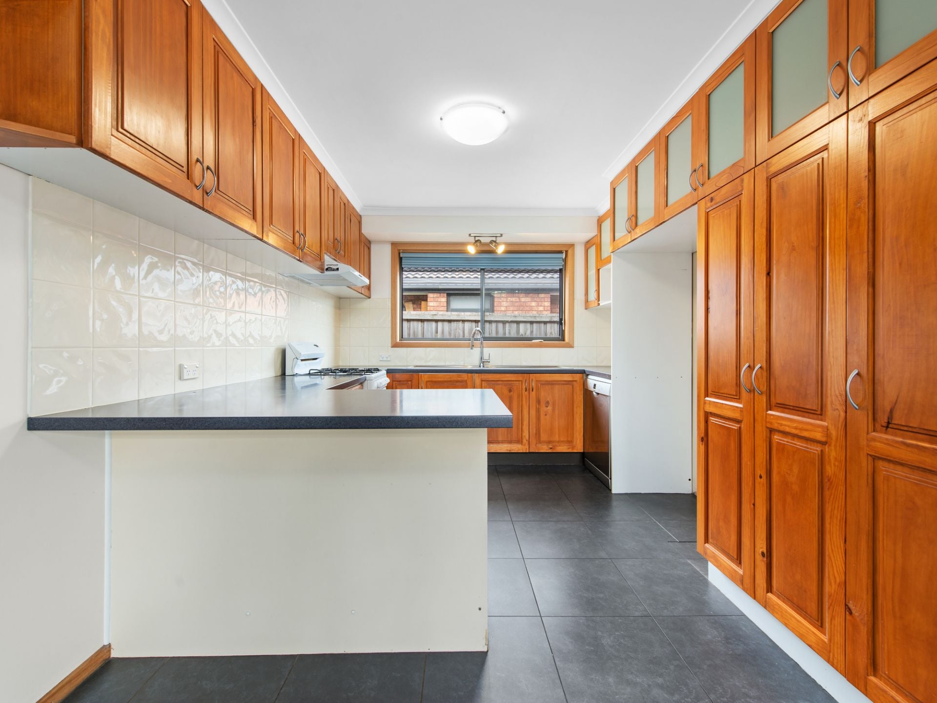 Timber kitchen with dishwasher, gas stove, large fridge cavity, and ample storage