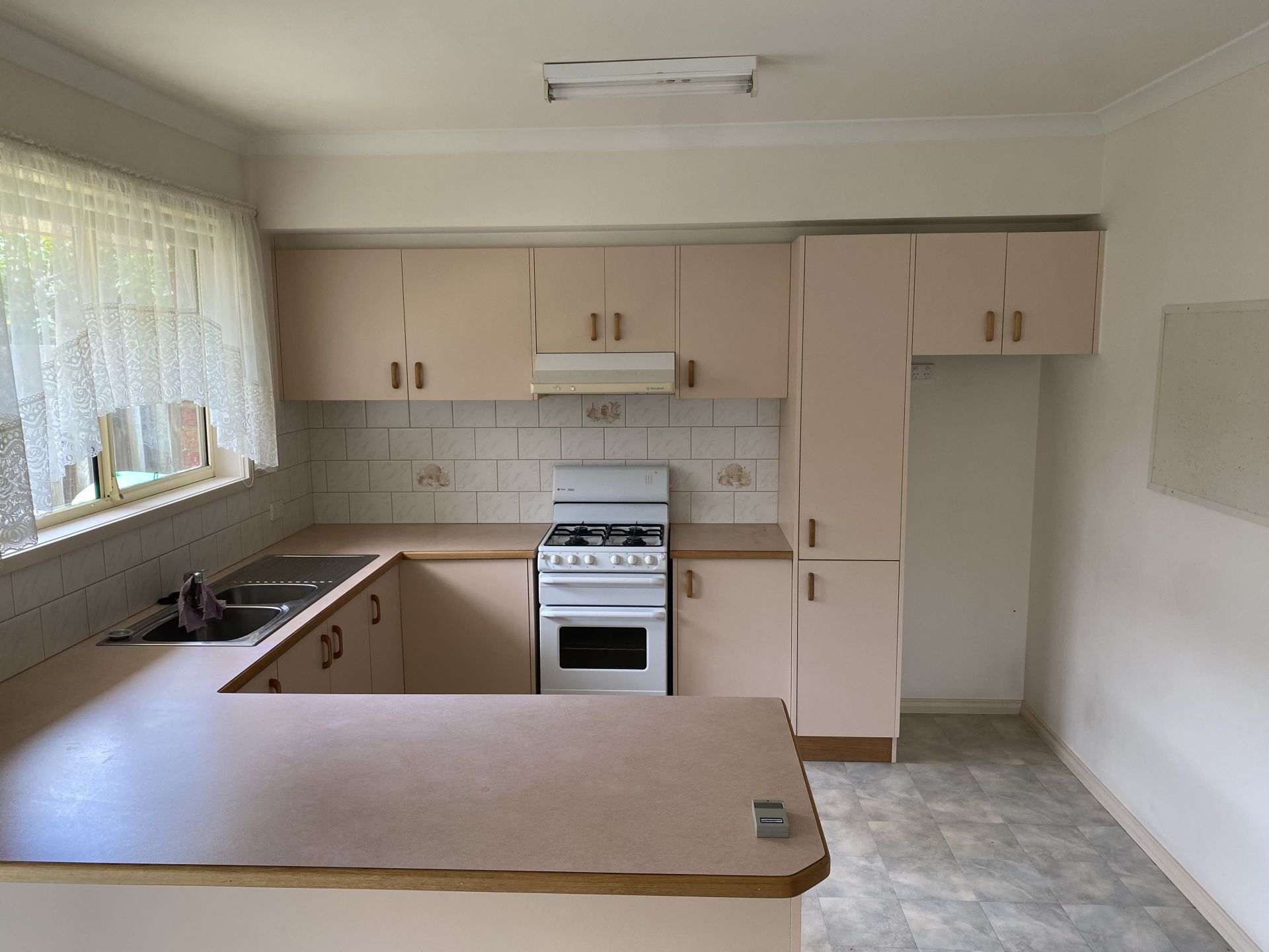 Kitchen and dining room has lino flooring, gas appliances, split system with plenty of storage.