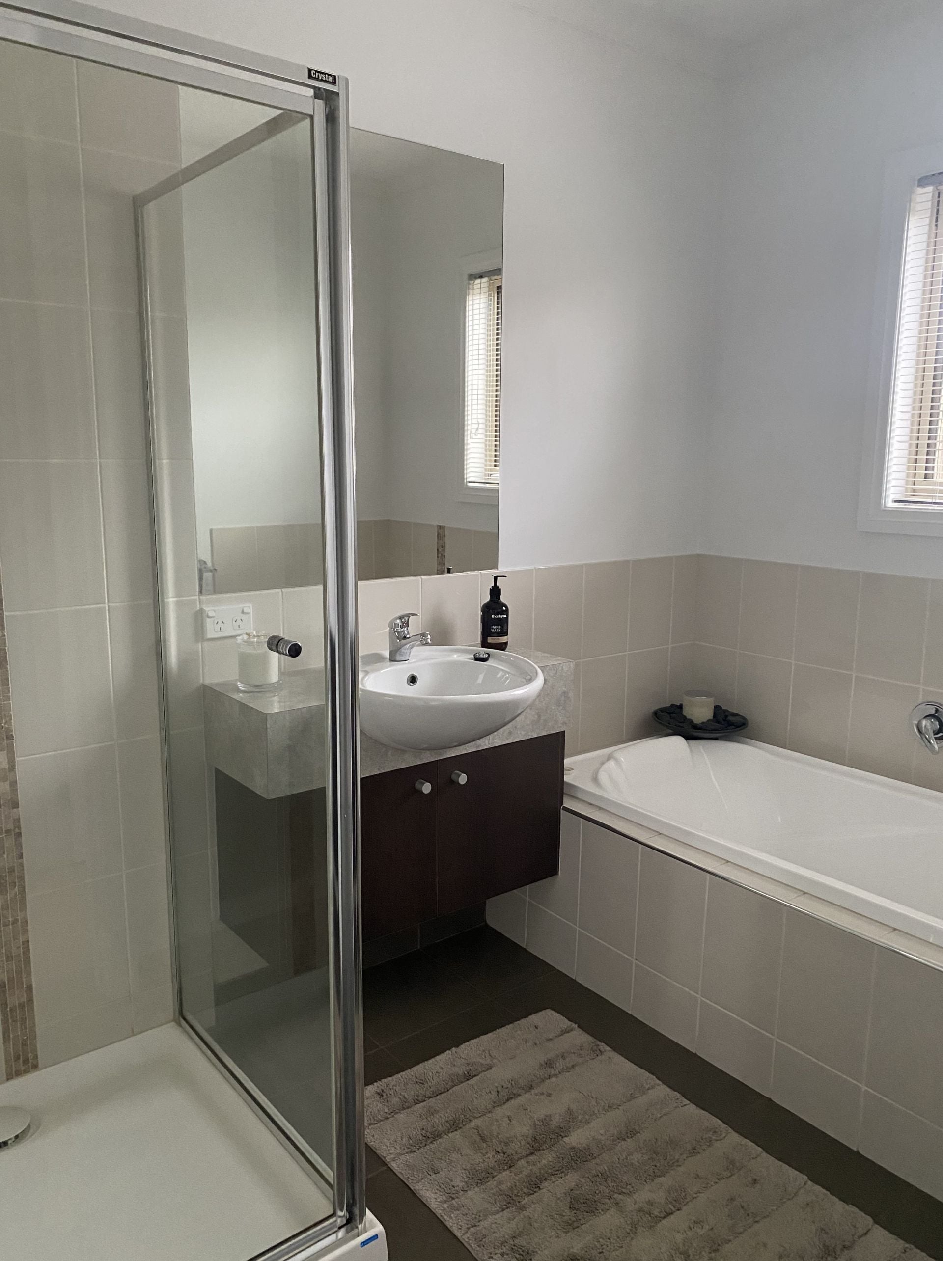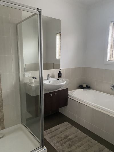 Bathroom is tiled, shower & bath