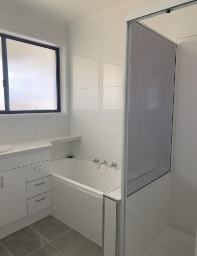 Bathroom has shower, bath and single vanity