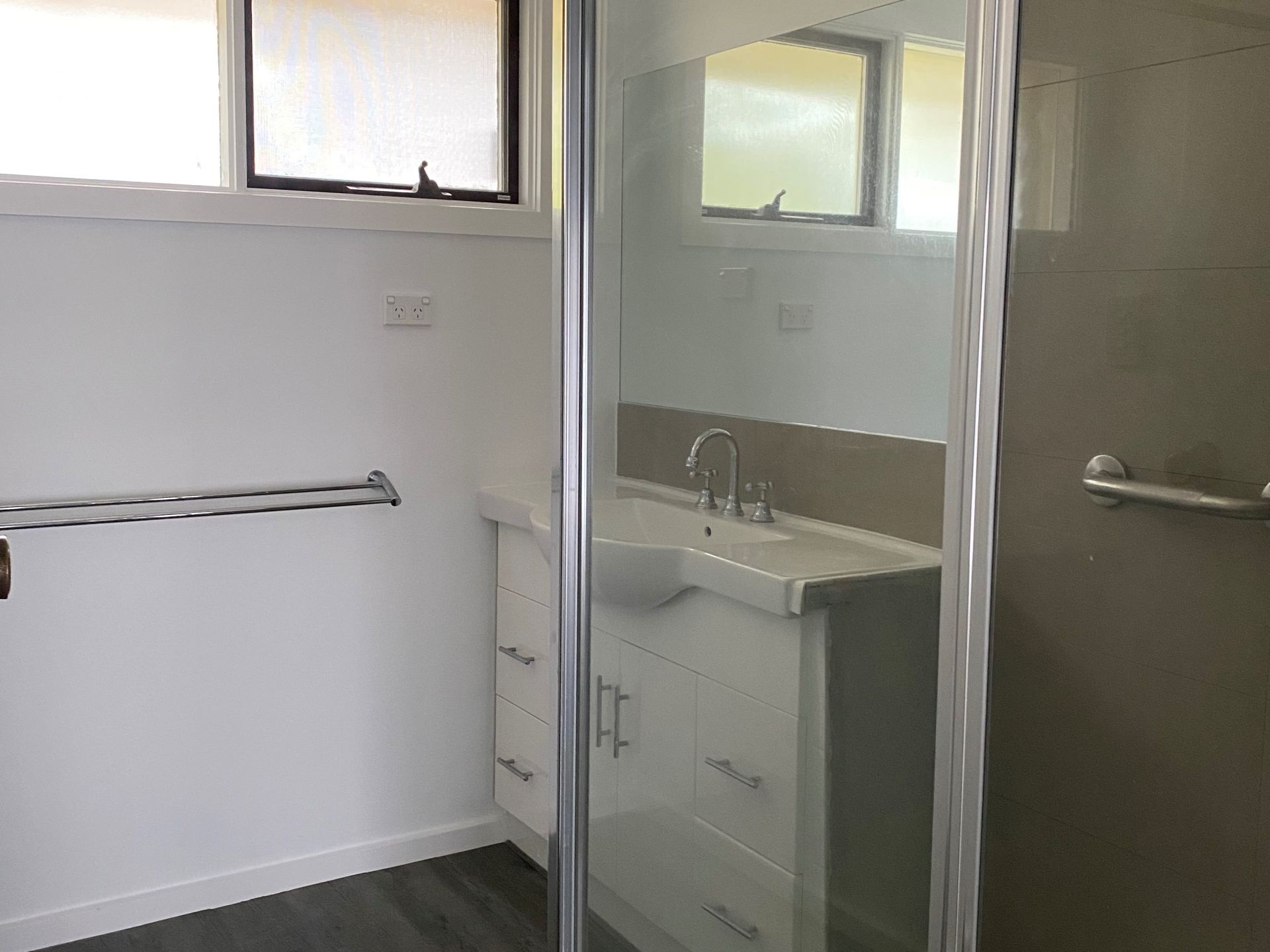 Bathroom has shower and large vanity unit,