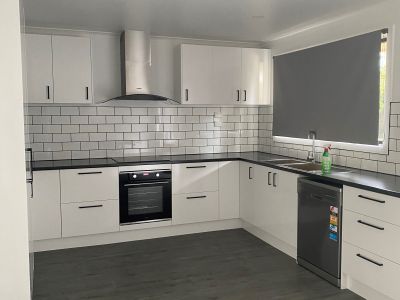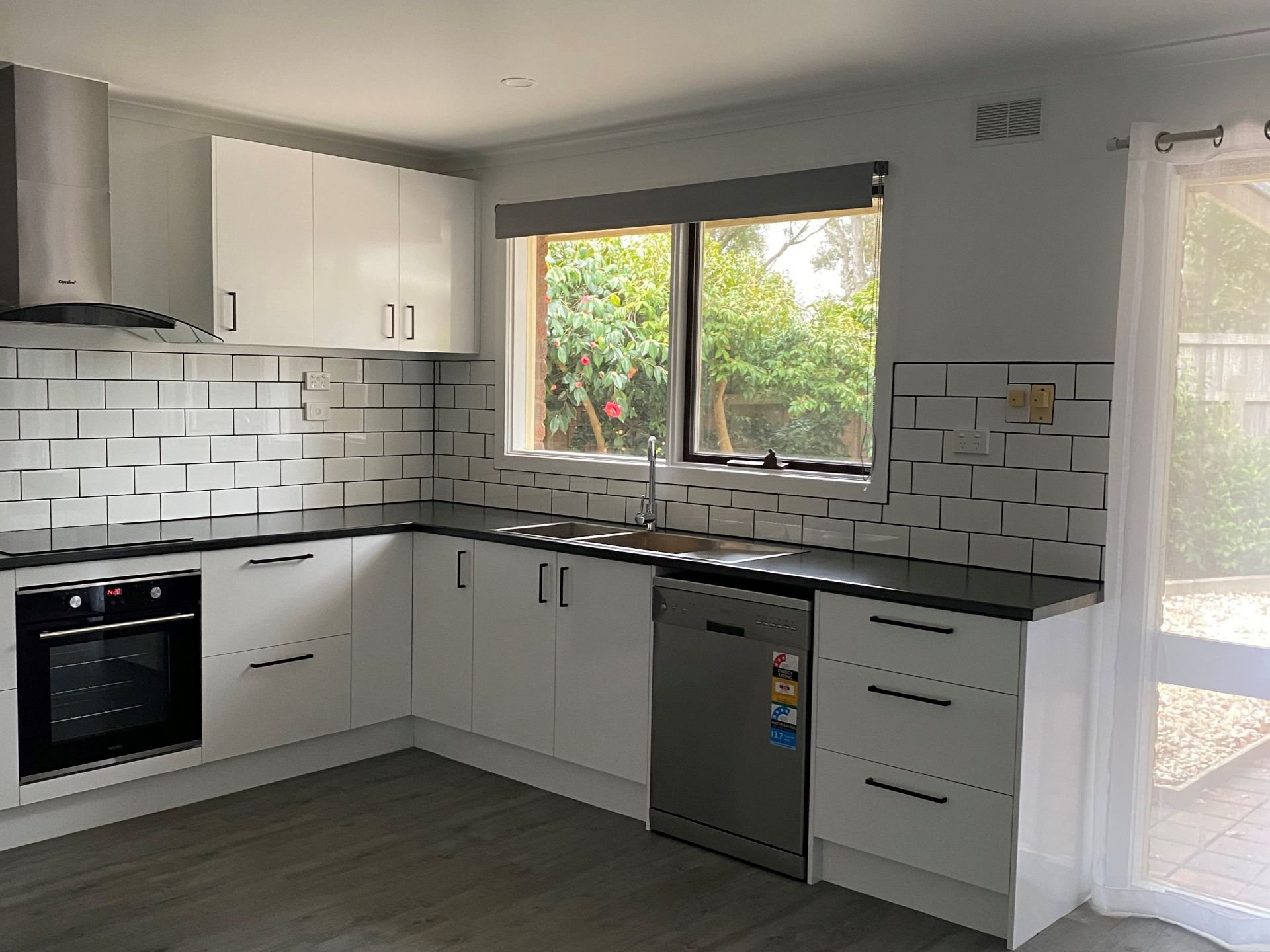 This modern kitchen has a dishwasher, electric cooking and is brand new.