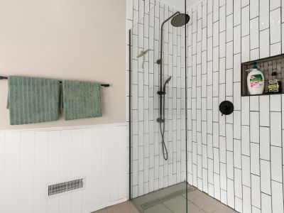 Master bedroom featuring a large walk-in robe and a sleek, fully renovated ensuite