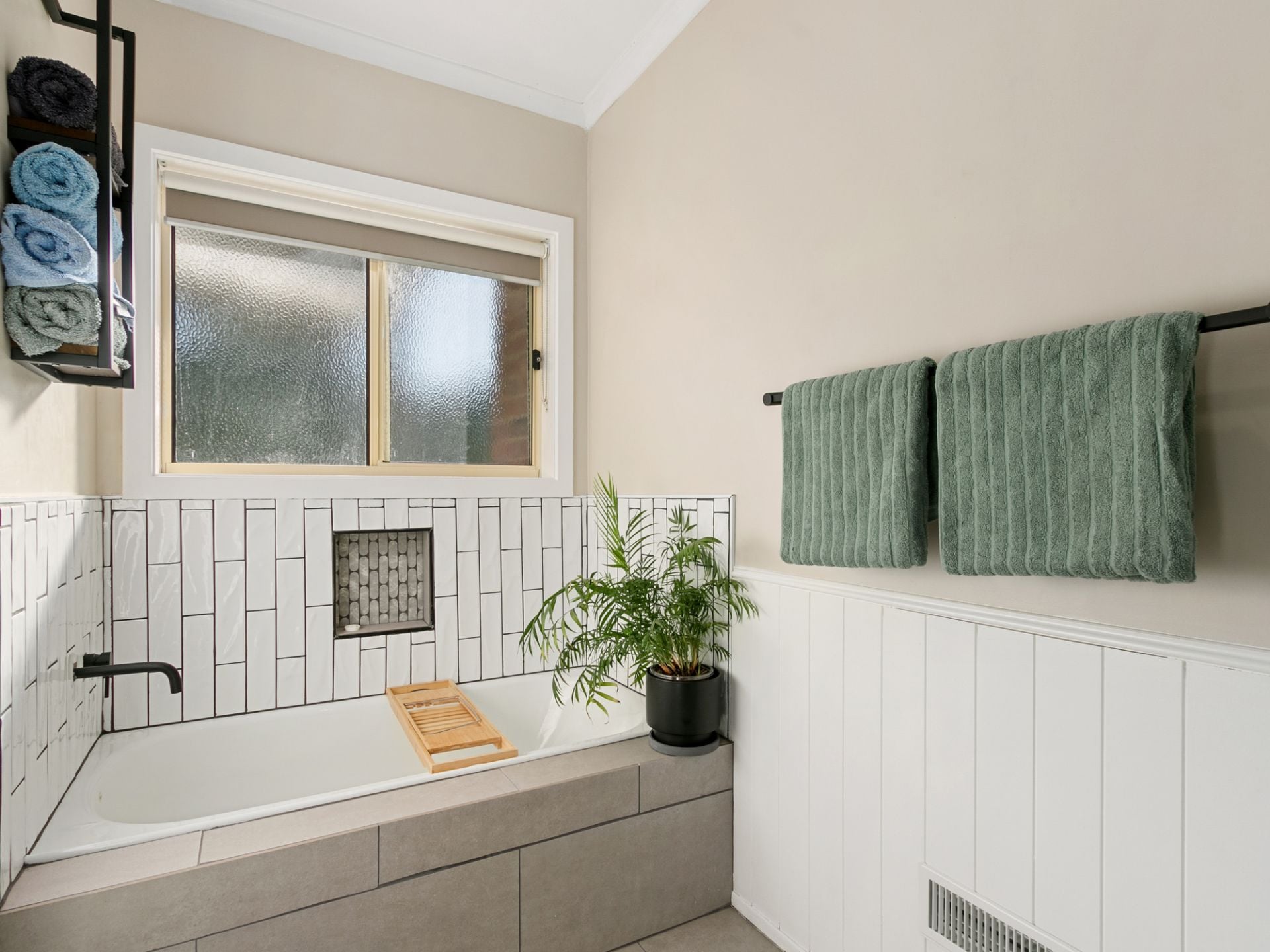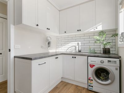 Renovated laundry with subway tile finish, matching the home's modern aesthetic
