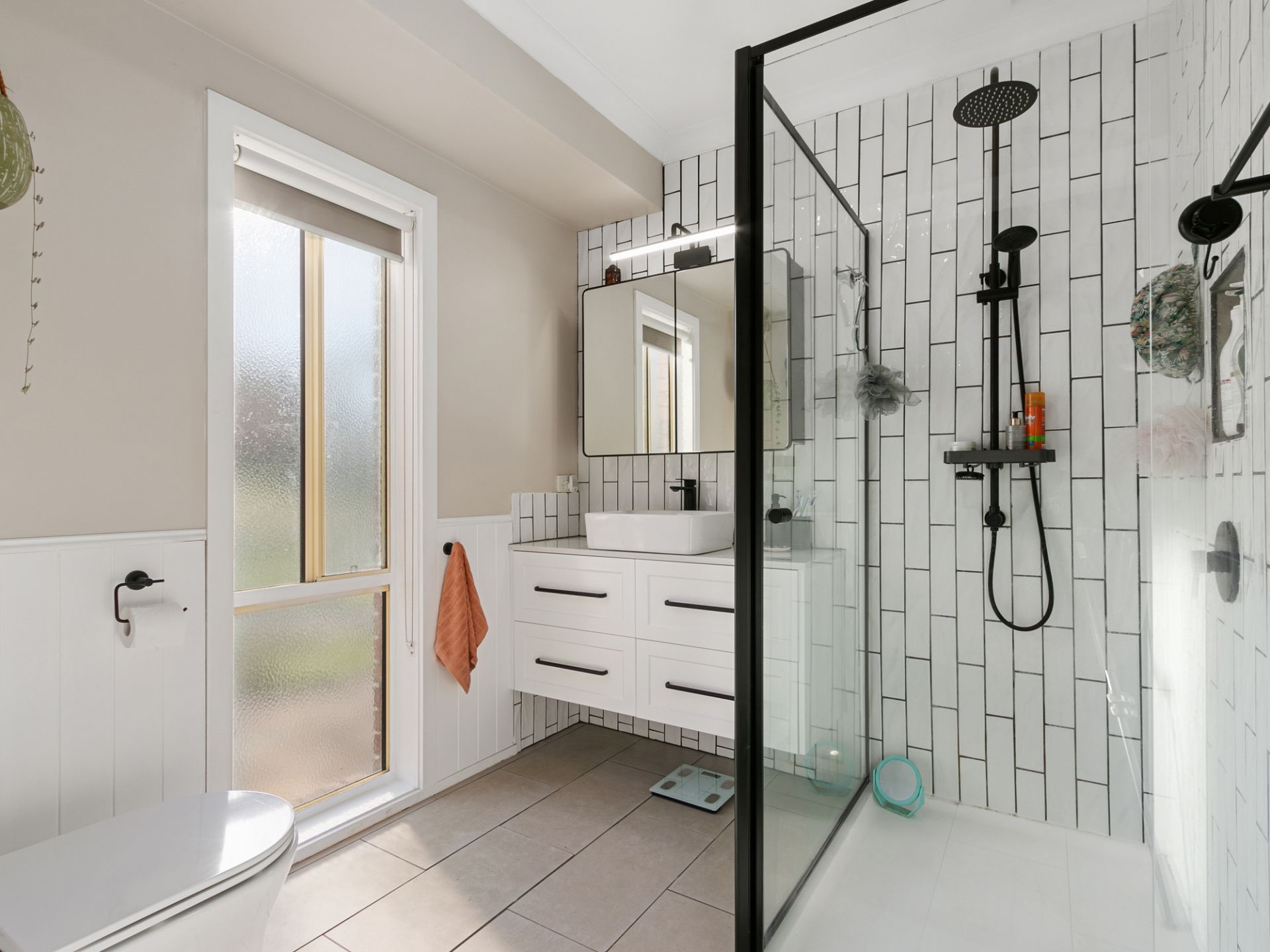 Stylish main bathroom with a walk-in shower, bath, powder room & separate toilet