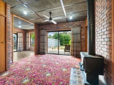 Step inside to discover a welcoming living area adorned with a wood fire that adds warmth and character to your home. With the added comfort of a ceiling fan, you can enjoy year-round coziness.