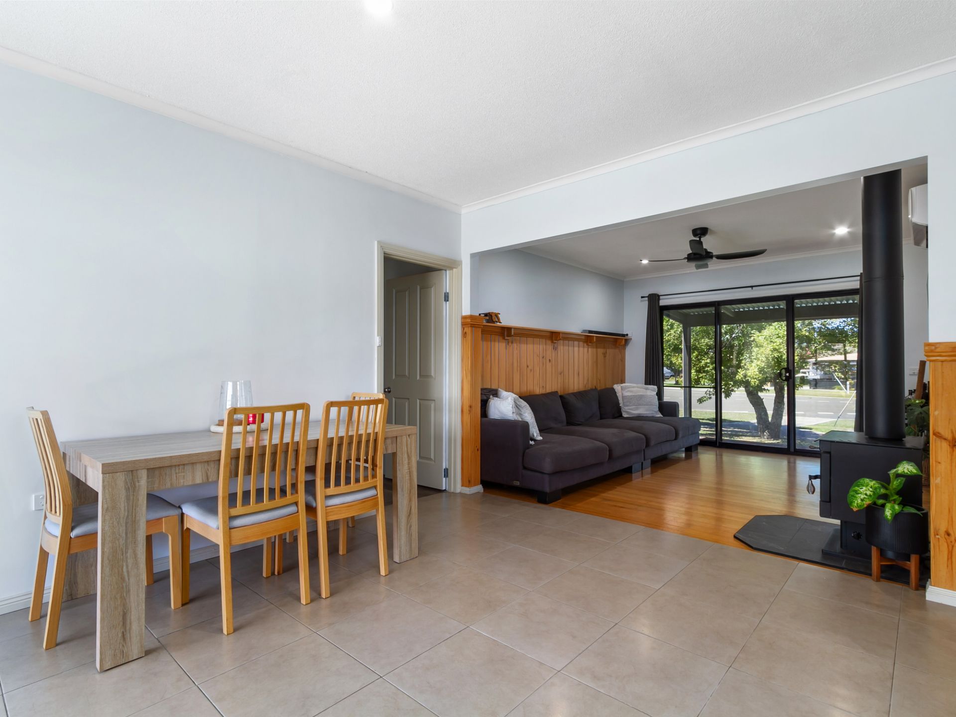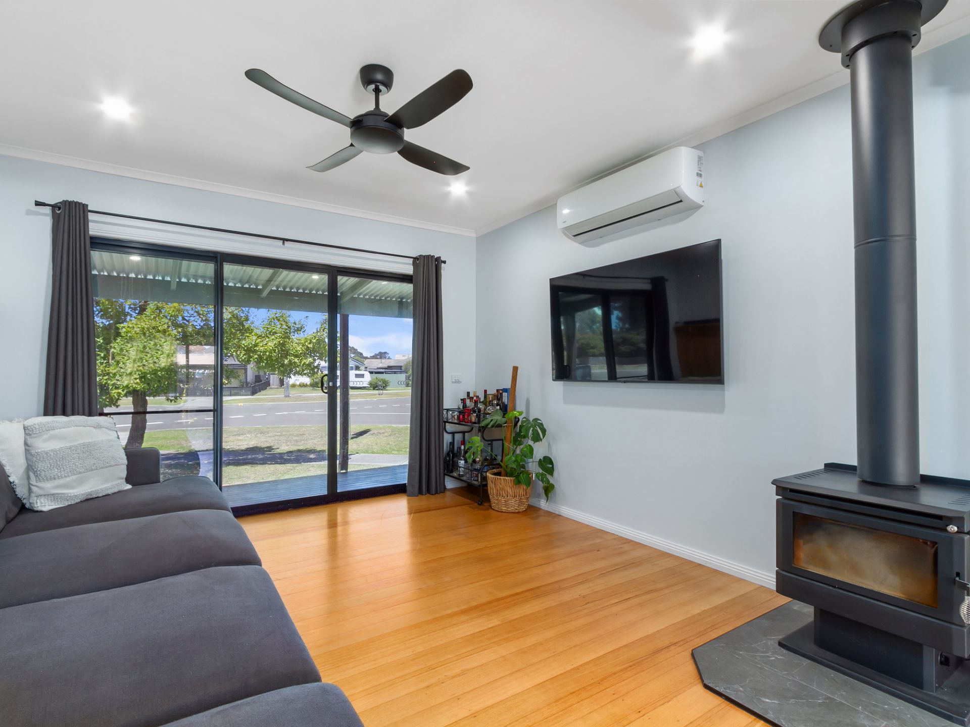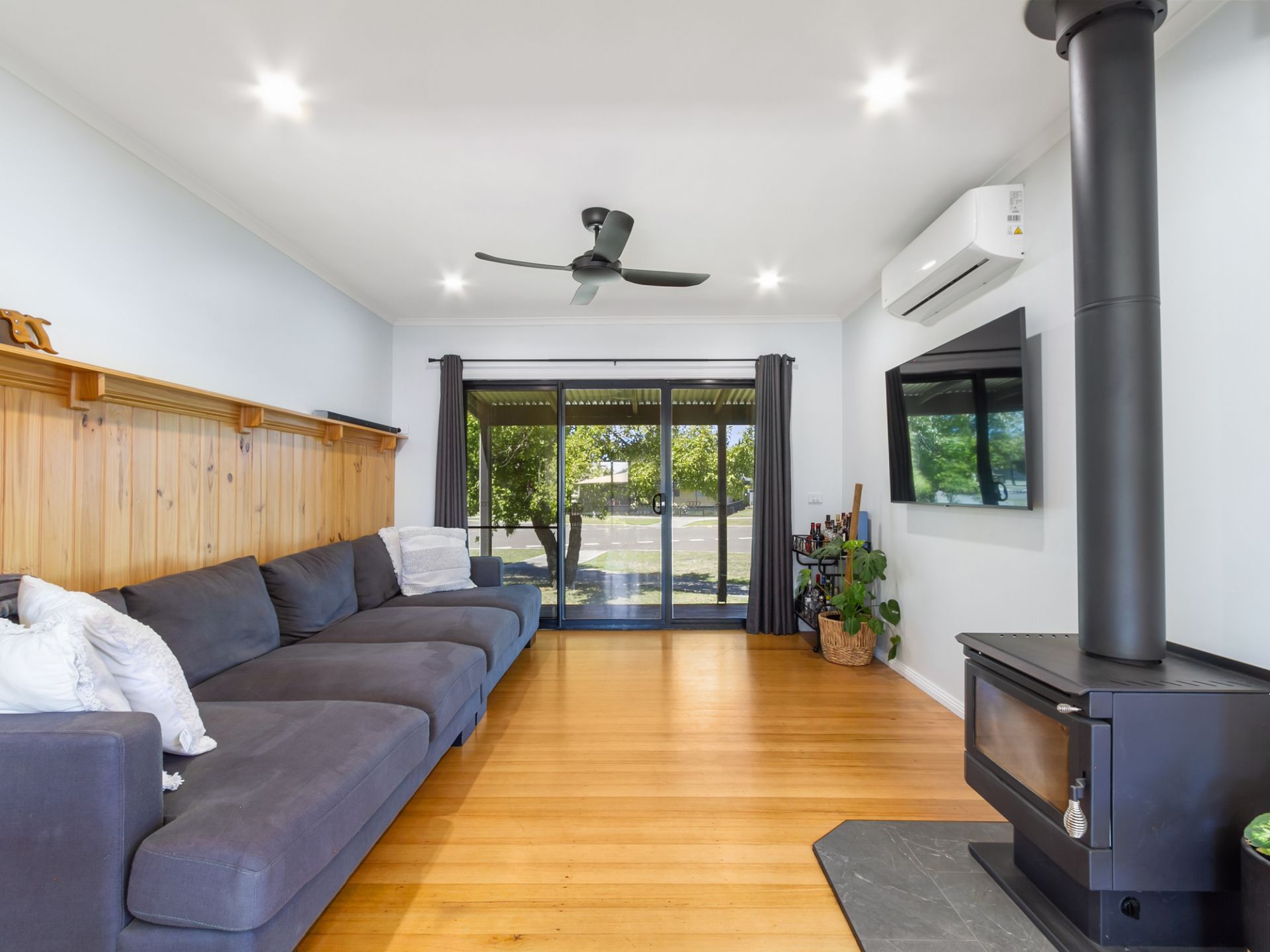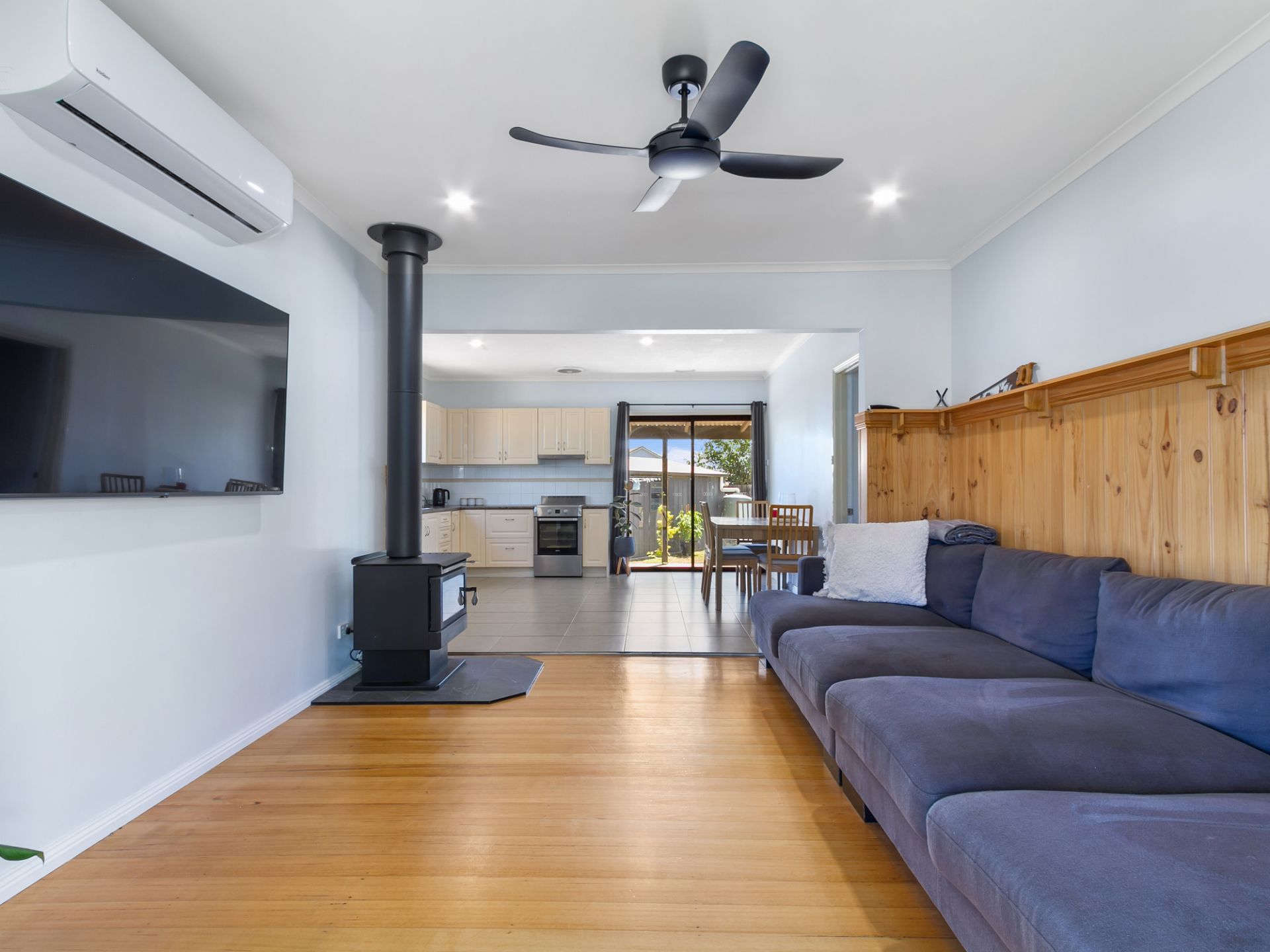 Comfortable living: Split system heating/cooling, cozy wood fire, and timber flooring throughout.