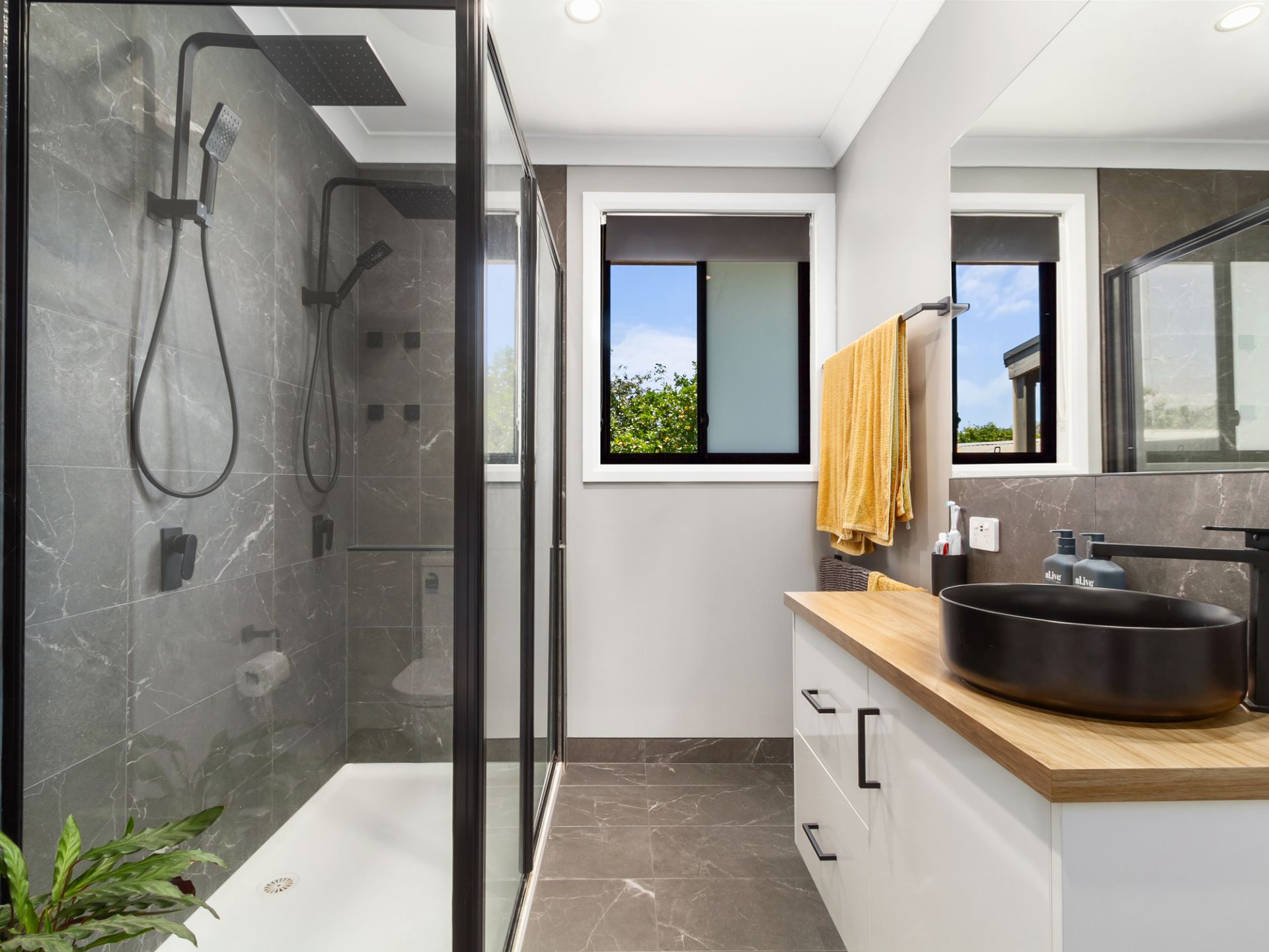 Stunning bathroom: Floor-to-ceiling tiles, double shower heads, and a luxurious, modern design.