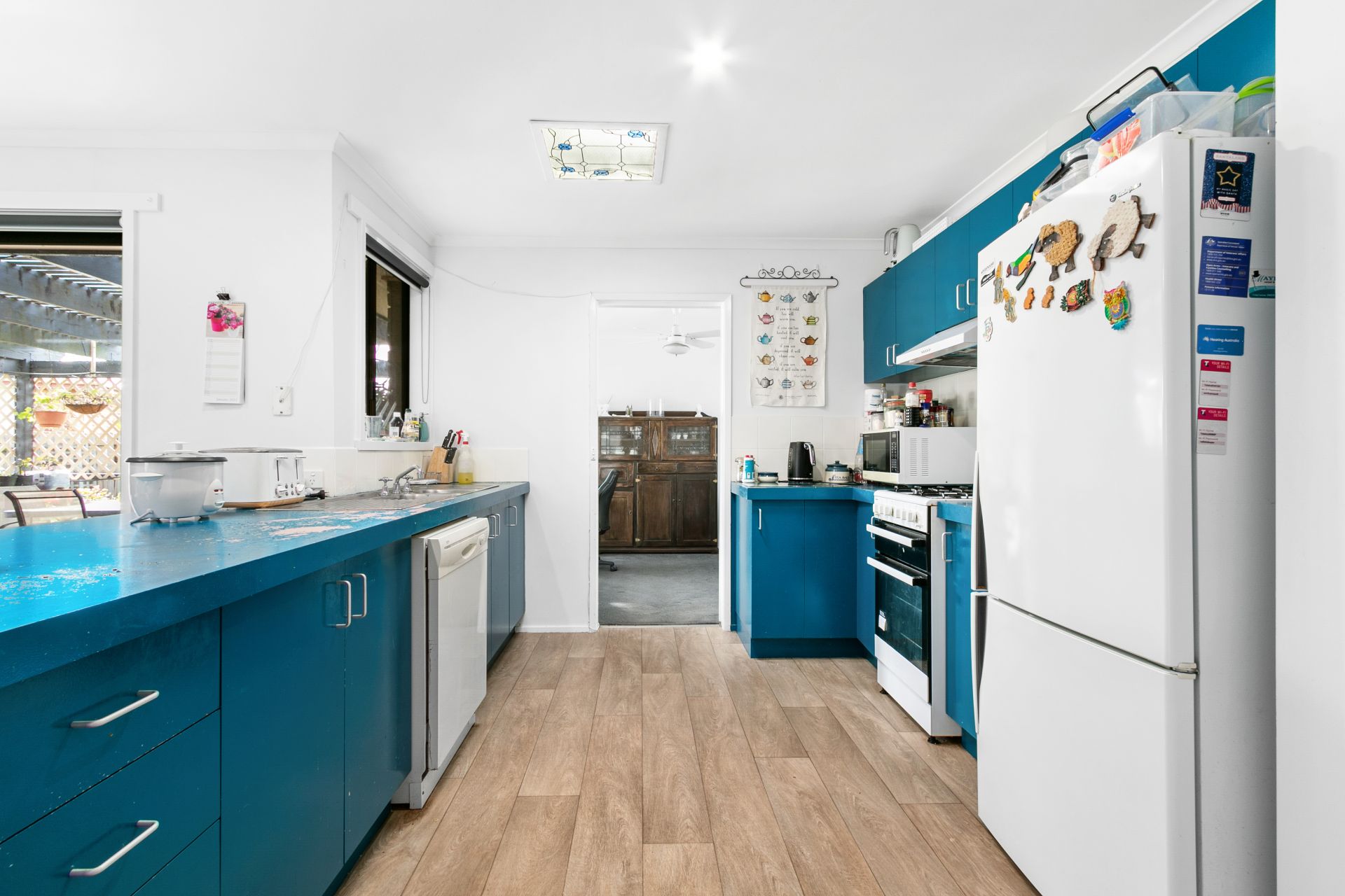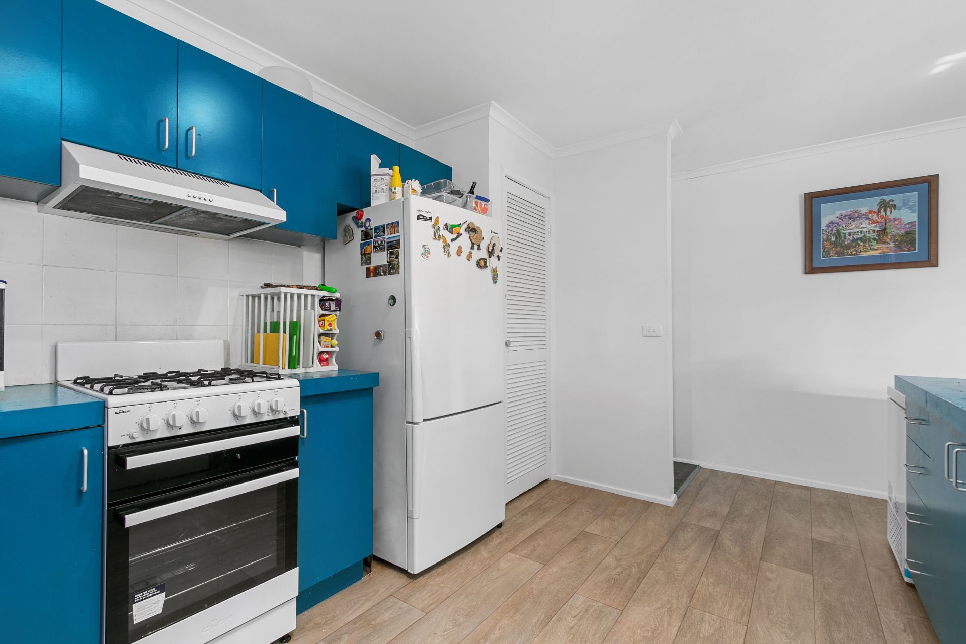 Fully equipped kitchen with a large bench space, standalone gas stove, dishwasher, and ample cabinetry.