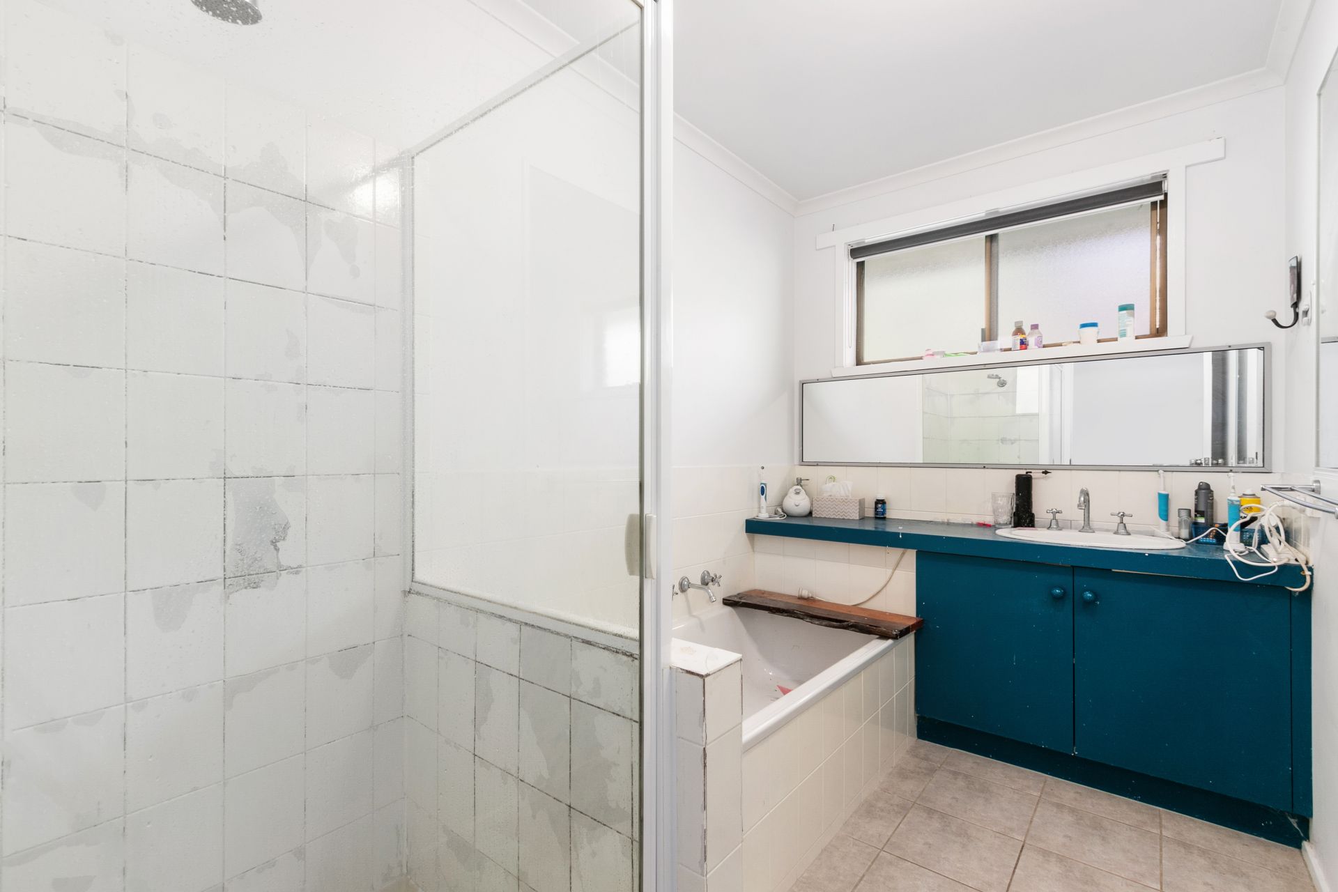 Bathroom features functional design featuring a separate bath and shower for added convenience.