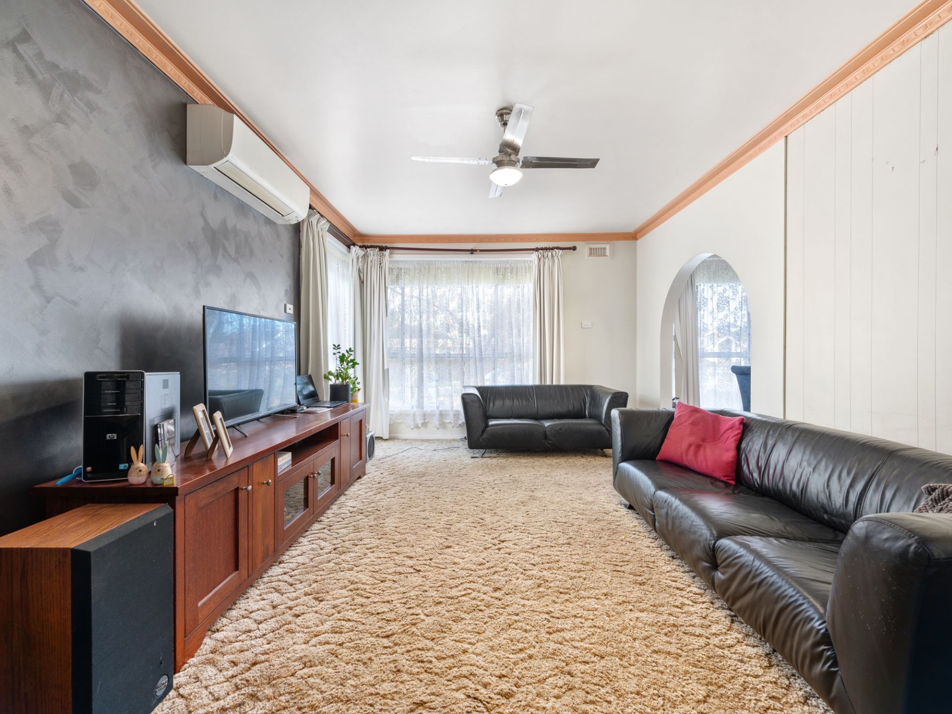 • Spacious living room with split-system air conditioning, a wood fire, and ceiling fan