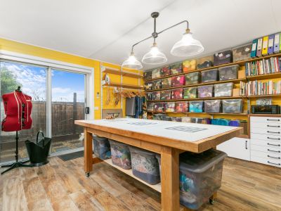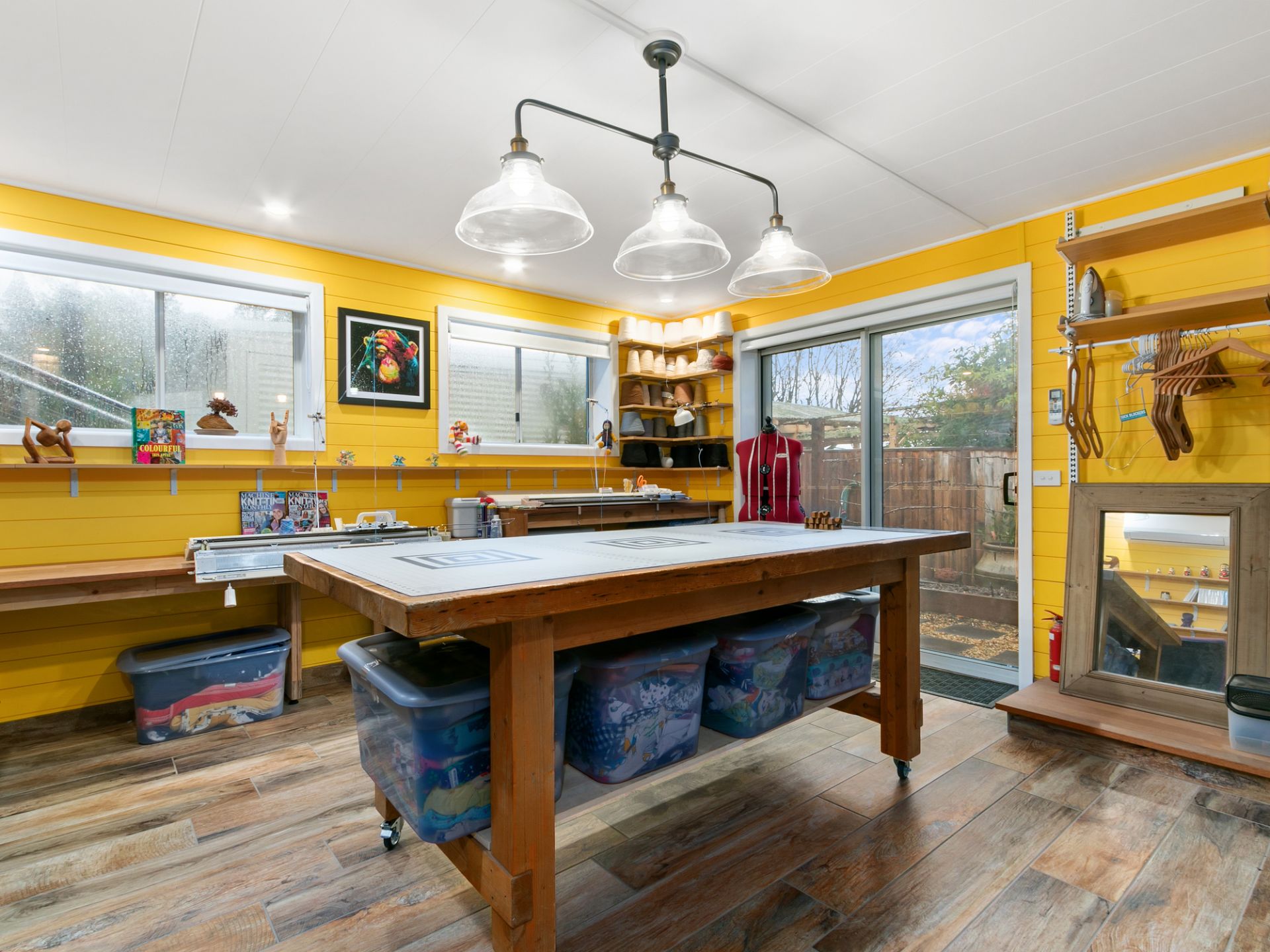 Yolk Studio is the brightly coloured space to release your inner creative. This could also be used as teenager/elderly retreat or a mixed use space for guests. Built in cabinetry and lots of bench space with added comfort of a Split system.